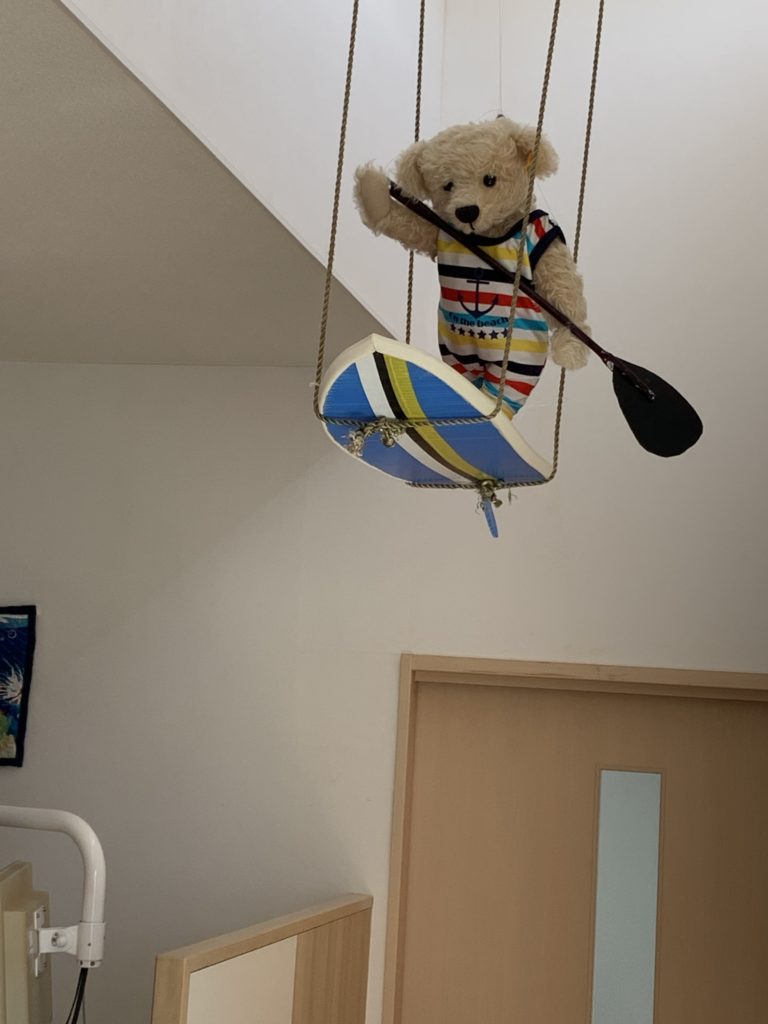せいだデンタルクリニックの吹き抜けでいつも見守ってくれているテディベアですが、今月は夏バージョンです。SUP(サップ)に初挑戦という事で……。サーフボードより少し大きいボードの上に立ち、パドルを漕いで水面を進んでいくというものです。