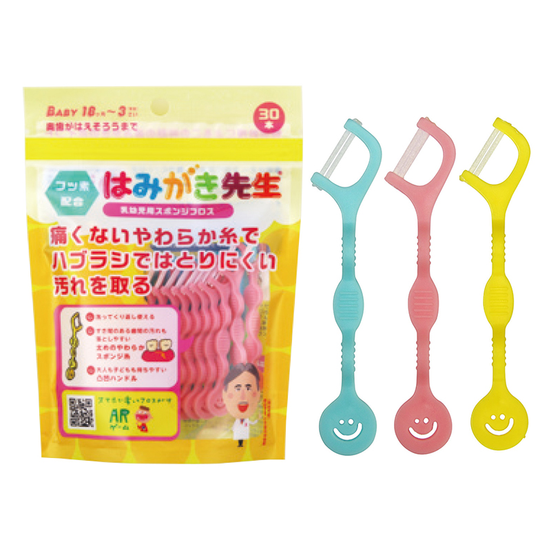 **子ども用・乳幼児用のスポンジフロス(はみがき先生シリーズ)**です。